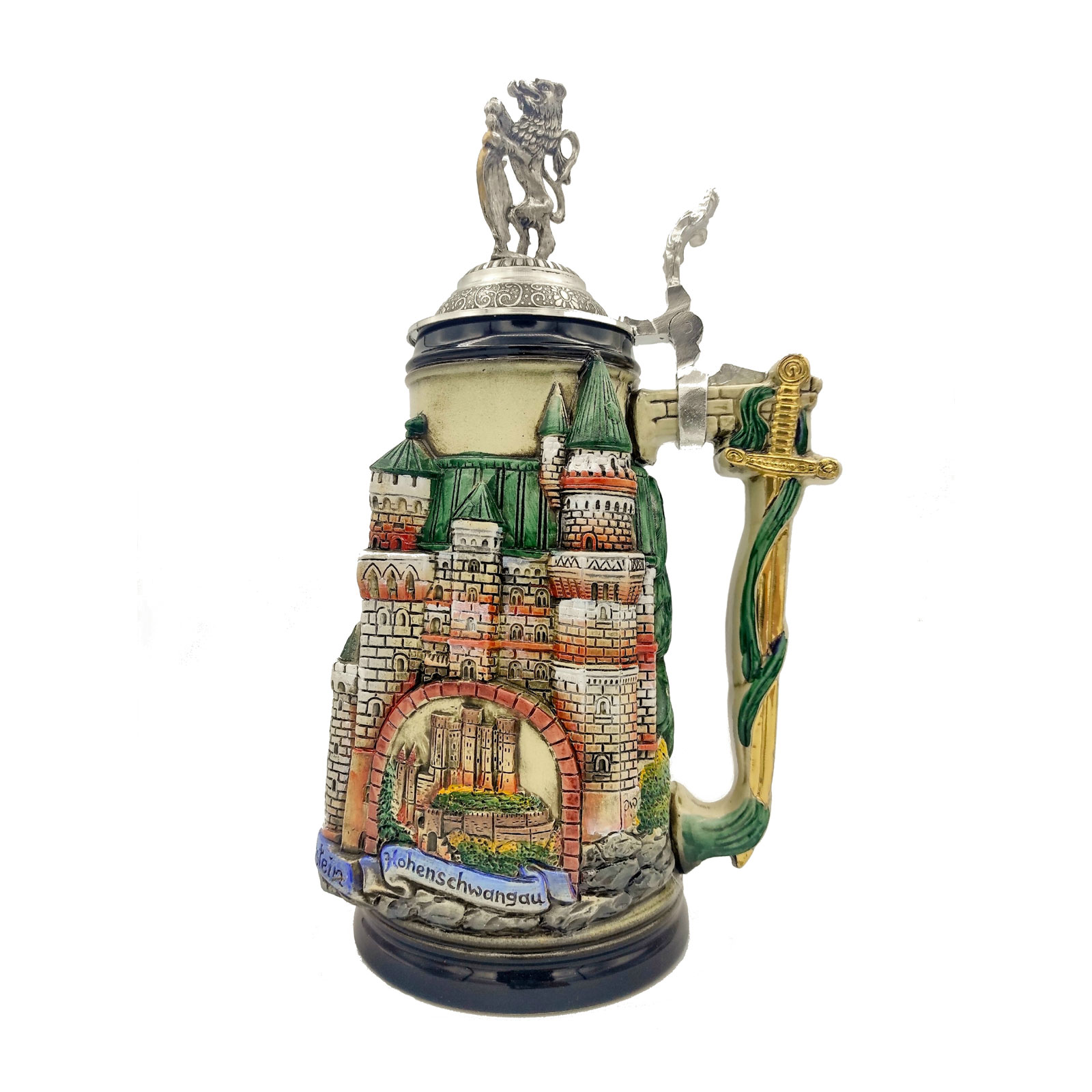 Sul boccale, realizzato artigianalmente e dipinto a mano, è raffigurato il grande Ludovico II Von Wittelsbach, qualche volta tradotto in italiano anche con la forma Luigi II, fu re di Baviera dal 1864 al 1886, anno in cui morì annegato in circostanze che non furono mai chiarite, visto che era considerato un ottimo nuotatore. Fu noto come un eccentrico la cui eredità si intreccia con la storia dell’arte e dell’architettura; infatti commissionò la costruzione di numerosi stravaganti castelli abeschi (il più famoso è il Neuschwanstein) e fu un devoto mecenate del compositore Richard Wagner. Fu generalmente benvoluto e ancora oggi è venerato da molti in Baviera. La sua propensione a costruire castelli ha lasciato una grandiosa eredità alla Baviera, in grado ancor oggi di attirare ogni anno milioni di turisti da tutto il mondo.